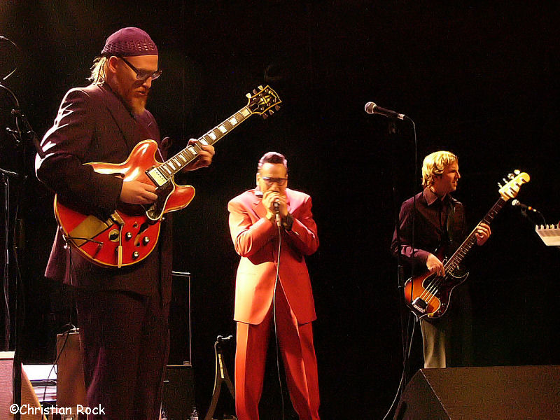 La performance du quatuor va se révéler aussi bouleversante qu?explosive surtout que la complicité entre chacun s?affirme perceptible et évidente. D?un côté, Rick, habillé d?un splendide costume rouge et de lunettes noires, coiffé d?une impeccable banane structurée, personnage qu?on croirait directement échappé d?un cartoon de Tex Avery, dispose d?une voix chaleureuse et enjôleuse, communique drôlement avec la salle et concocte un jeu de scène aux déhanchés surprenants. Mais c?est principalement lorsqu?il porte ses harmonicas aux lèvres, installés sur un présentoir à côté de lui, qu?il transmet le mieux l?émotion, tendre et vive à la fois et étonne même en plaçant un de ses « ruine babines » dans la bouche sur un morceau sans pour autant perdre de feeling? Stupéfiant !